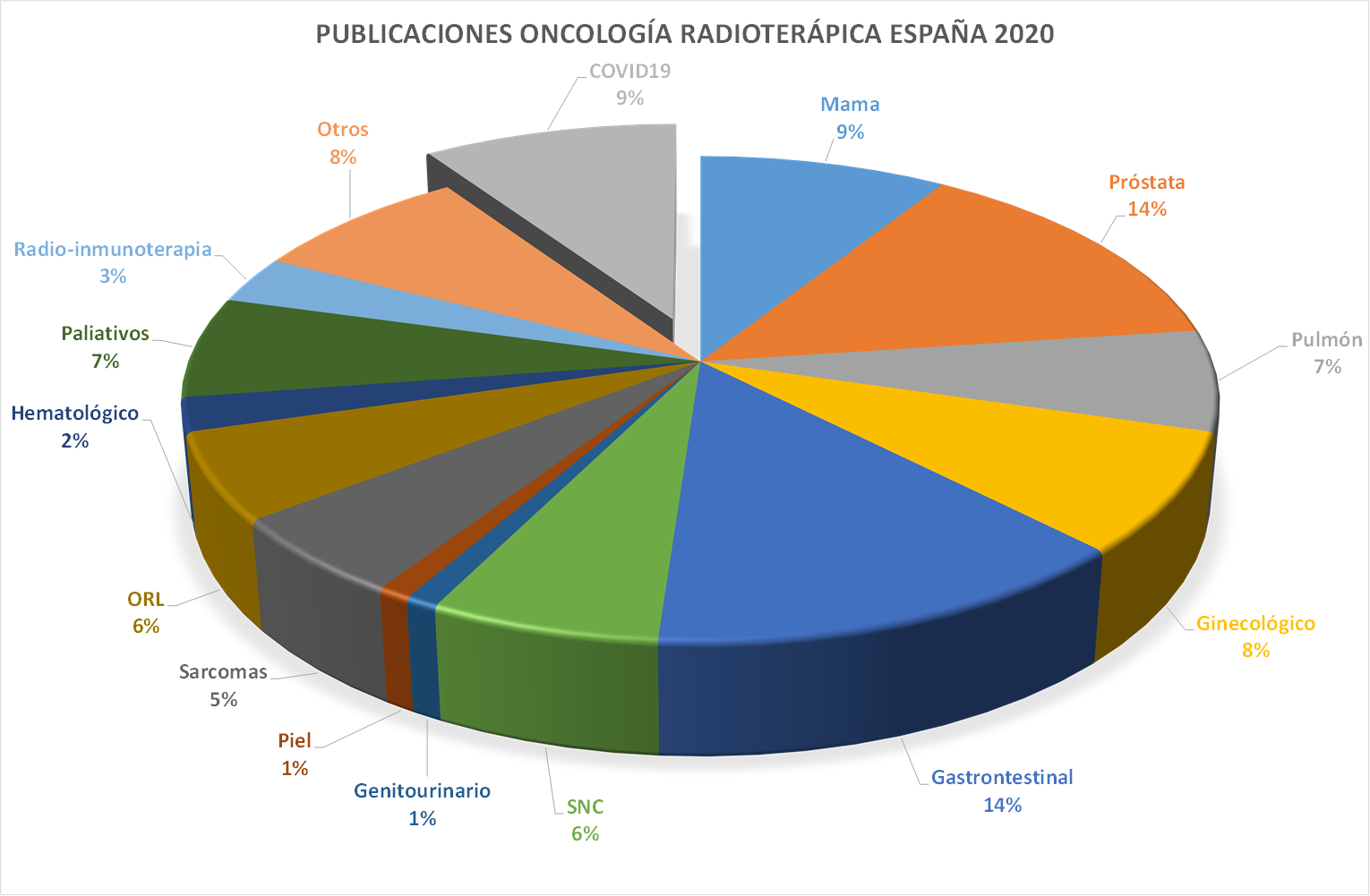 De especial interés ha sido en 2020 la cantidad de publicaciones centradas en la pandemia por COVID-19, representando un 9% del total de referencias, y al mismo nivel que las dedicadas al cáncer de mama. Hemos publicado tanto trabajos que recogen la utilidad de la radioterapia pulmonar a bajas dosis en la neumonía por COVID-19, con resultados clínicos ya publicados y muy prometedores, como artículos sobre la adaptación de la radioterapia de distintas localizaciones a la actual pandemia y de los oncólogos radioterápicos a todos los cambios que han venido asociados. Todos estos artículos, que merecen especial reconocimiento, pueden consultarse aquí:
