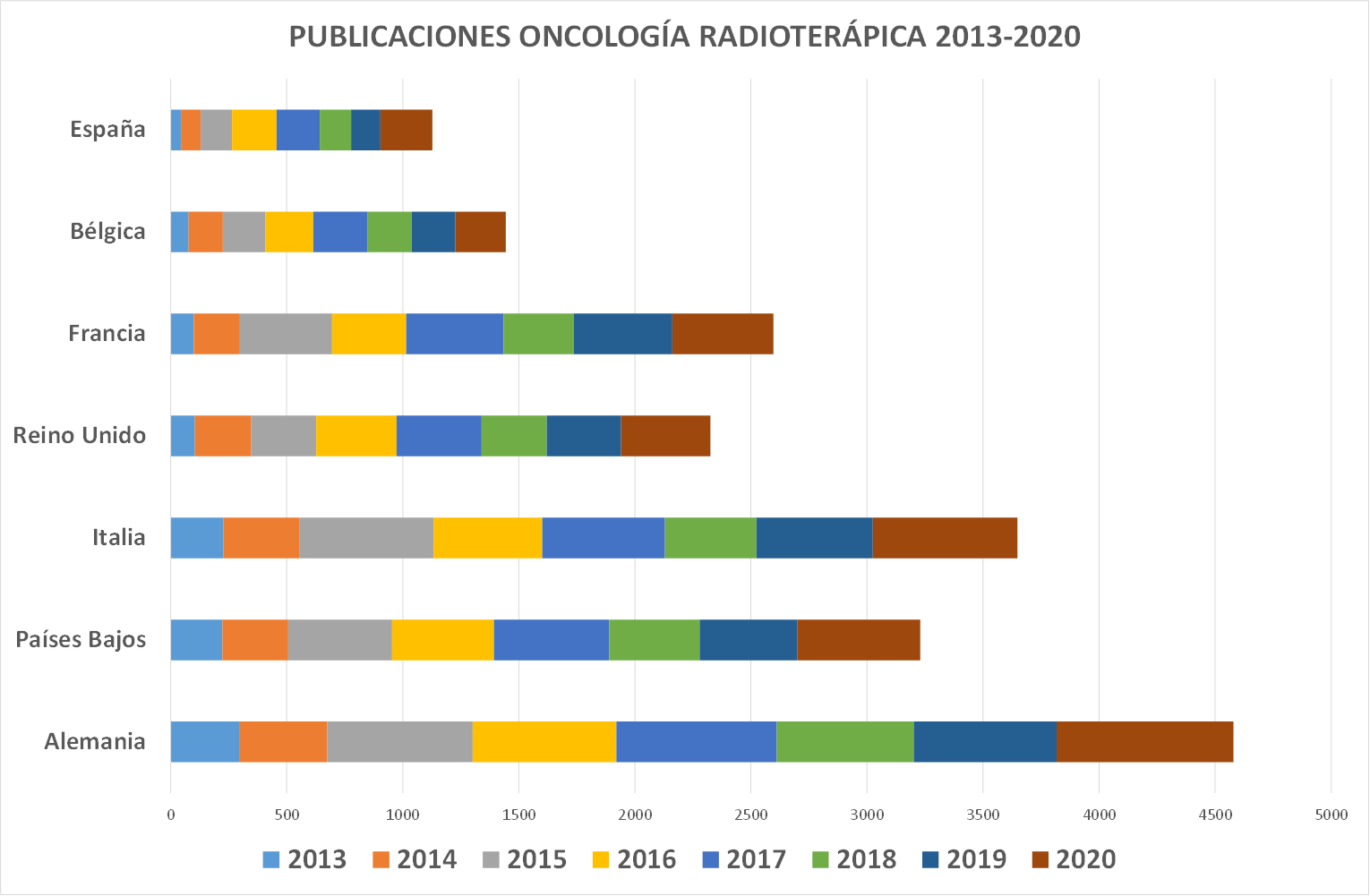 Sí, hemos publicado más en 2020, pero también lo han hecho en el resto de países de la UE, y en demasiados casos en un porcentaje mayor al nuestro. Por una parte, el aumento del número de revistas incluidas en estas bases de datos y repositorios y por otro lado, un año atípico como el pasado 2020, marcado por la pandemia COVID-19 que ha obligado a largos confinamientos y a reducir muchas otras actividades y dado que la producción científica del oncológo radioterápico patrio está ligada estrechamente al aprovechamiento de sus momentos de ocio extra-hospitalarios para intentar plasmar en artículos sus experiencias, son dos factores que indudablemente han contribuido también a este aumento de publicaciones. Con todo, vaya desde aquí el reconocimiento y homenaje a todos los oncólogos radioterápicos españoles que, además de su dedicación asistencial, encuentran tiempo, ganas y valor para dedicar parte de su esfuerzo a difundir y publicar su trabajo contribuyendo al avance de la Medicina en global y de la Radioterapia en particular.